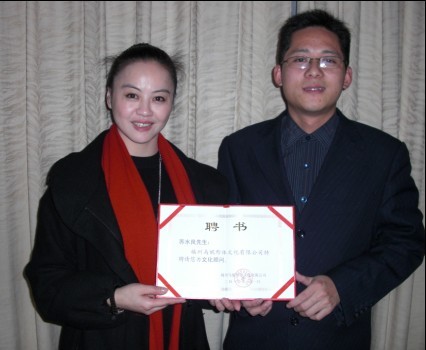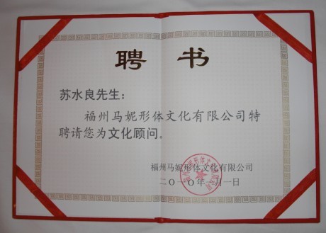 图为:福州马妮形体文化有限公司资深形体教师李青为苏水良颁发文化顾问聘书