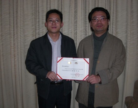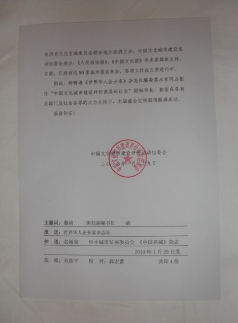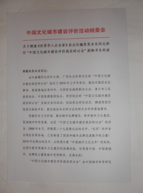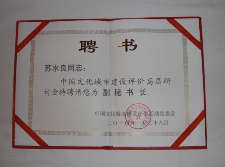 图为中国文化城市学会秘书长、中国文化城市建设评价活动组委会秘书长王麒景(右)向苏水良副秘书长(左)颁发聘书。
