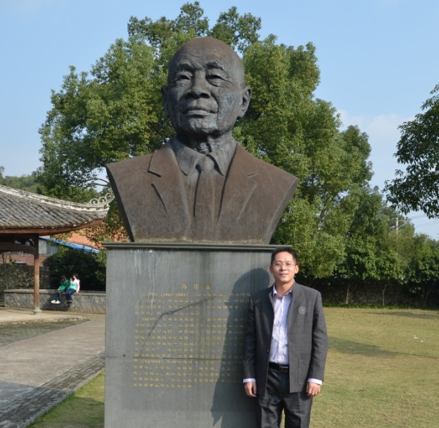 财富海西杂志社社长、总编辑,福建省苏氏委员会副会长、秘书长苏水良在苏步青雕像前留念。