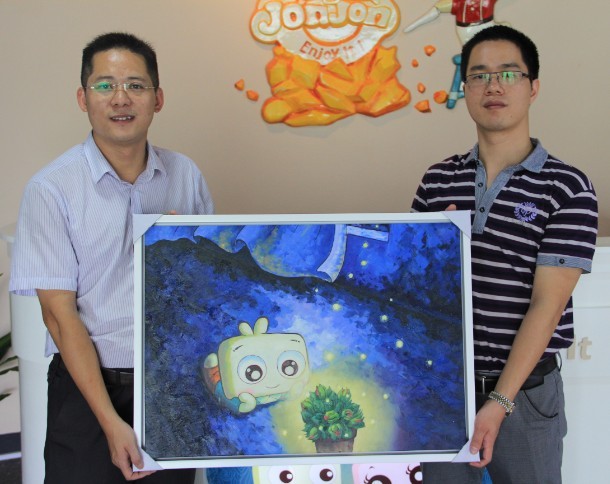 2013年8月15日,财富海西杂志社社长、总编辑苏水良在福州拜访福建金豹动画设计有限公司董事长朱玉奇,朱董事长赠送动漫油画并合影留念。