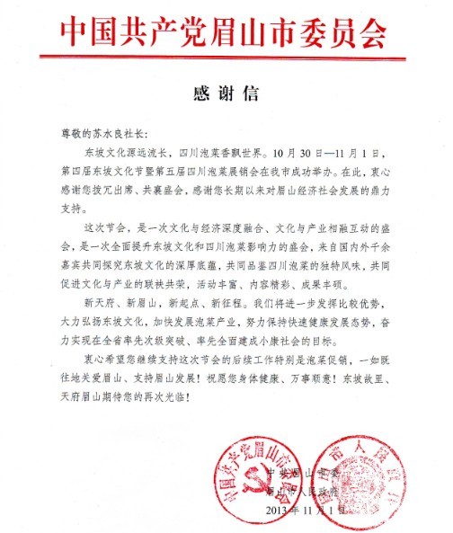 眉山市委、市政府给《财富海西》的感谢信