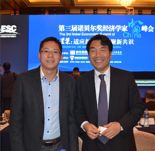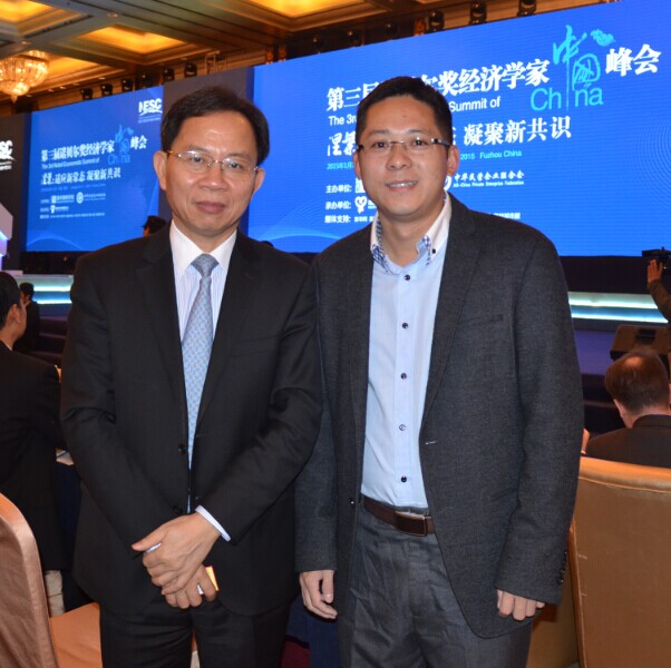 2015年1月10日,第三届诺贝尔奖经济学家中国峰会在榕举行,《财富海西》杂志社社长、总编辑苏水良与福州大学党委书记陈永正合影留念。