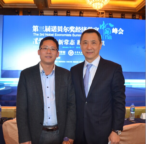 2015年1月10日,第三届诺贝尔奖经济学家中国峰会在榕举行,《财富海西》杂志社社长、总编辑苏水良与新华都商学院理事长何志毅教授合影留念。