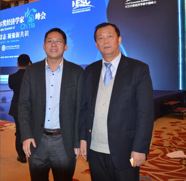 2015年1月10日,第三届诺贝尔奖经济学家中国峰会在榕举行,《财富海西》杂志社社长、总编辑苏水良与国务院发展研究中心原副主任候云春合影留念。