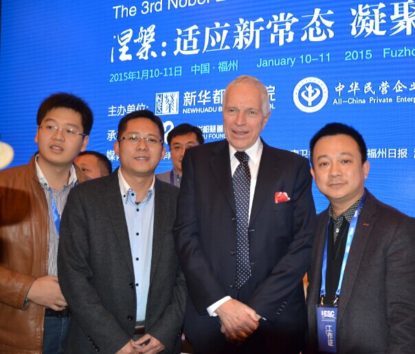 2015年1月10日,第三届诺贝尔奖经济学家中国峰会在榕举行,《财富海西》杂志社社长、总编辑苏水良与新华都商学院院长埃德蒙·费尔普斯合影留念。