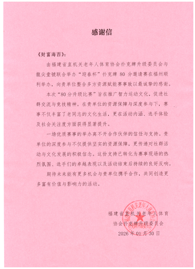 2026年1月30日,福建省人大书画院副院长兼秘书长,福建省关工委副主任兼学校委副主任,福建省直机关老年人体育协会扑克牌升级委员会主任温佳禄;福建省老干部活动中心团队长于亚平为《财富海西》颁发感谢信。