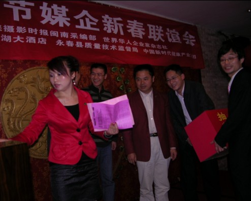 2010年元宵节媒企新春联谊会主办单位之一《世界华人企业家杂志社》,苏水良编委在抽取此次座谈会一等奖的奖票。