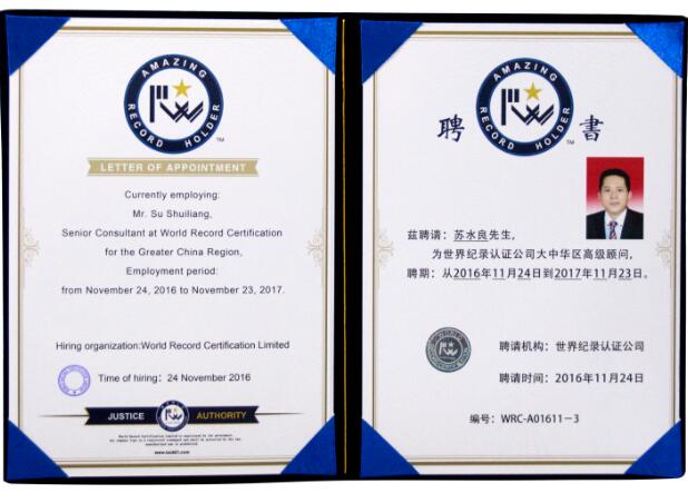 聘任苏水良为世界纪录认证公司大中华区高级顾问