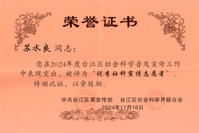 苏水良同志评为福州市台江区“优秀社科宣传志愿者”称号