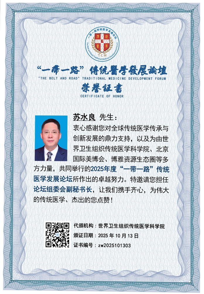 苏水良聘为“一带一路”传统医学发展论坛组委会副秘书长