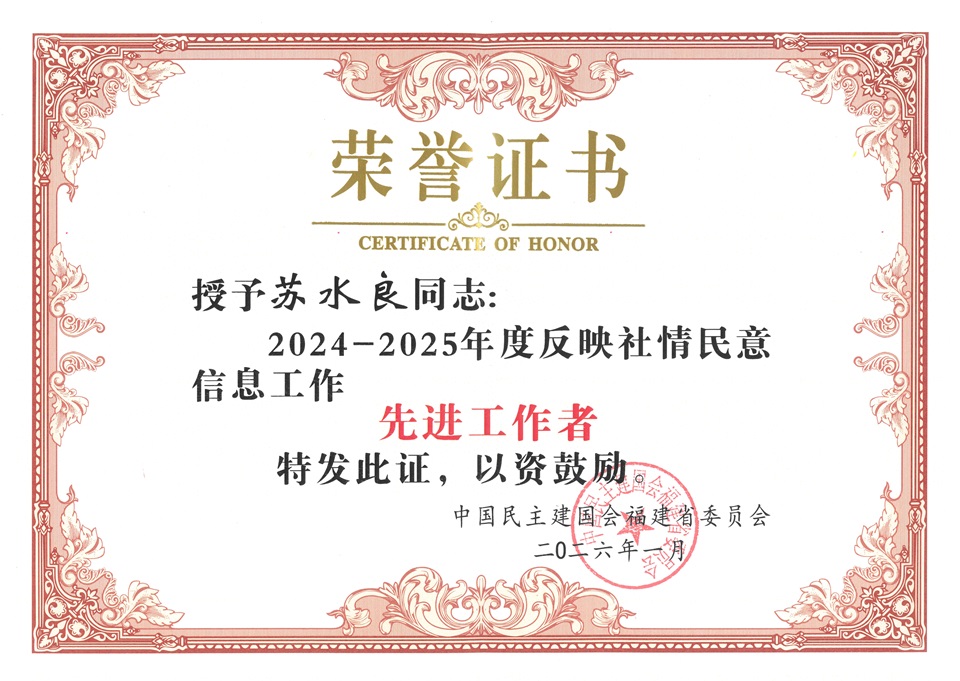 苏水良荣获民建福建省委2024-2025年度反映社情民意信息工作先进工作者